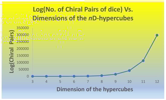 Figure 2 shows a plot of log10 (number of chiral pairs) of nD-dimensional hypercubes as a function of n derived from the data obtained in Table 1 for the number of chiral pairs. As these numbers grow astronomically, we computed the log10 of the number of chiral pairs. As can be seen from Figure 2, the resulting plot reveals a J-type curve as a function of n. Given that the number of chiral pairs has already been scaled to a logarithmic scale, indeed, the J-curve for the combinatorial numbers of dice is quite astonishing.