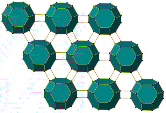 A number of mesoporous materials and zeolite structures are networks of various shapes that we have considered in this study. For example, the structure of the tetragonal zeolite farneseite [], shown in Figure 5, consists of several truncated octahedra. The combinatorics of a truncated octahedron was considered, as shown in Table 4, among several other structures of octahedral or cubic symmetries. Consequently, when dice enumerations are specialized to the case of a few chosen types of colors, the combinatorics considered reduces to face colorings of complex zeolite types of structures like the one shown in Figure 5. That is, face colorings would correspond to the enumeration of isomeric structures that would arise from face capping of zeolite structures, analogous to the one shown in Figure 5. It is hoped that the present work will stimulate such applications to such novel nanomaterials in the future.
