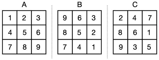 A visual representation of three alternative cell-updating orders, (A–C), arbitrarily chosen under the modified update regime (regime (2)).