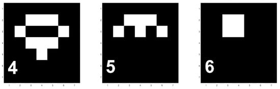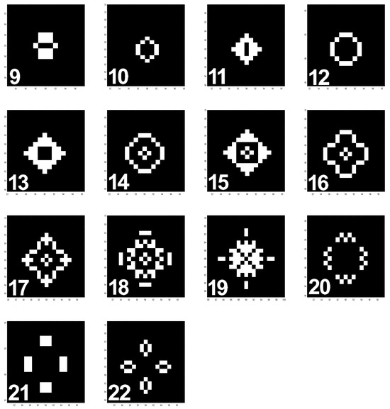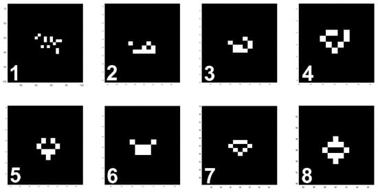 In this regime, the initial pattern, marked with “1” in Figure 2, does not possess symmetrical properties. In the fourth step of the GoL run on classical deterministic rules, the asymmetric pattern takes on a form characterized by the point symmetry group. The point symmetry group is one where an organism (shape) can be divided into two identical halves by a single plane. Many living organisms belong to this group, including most invertebrates and all vertebrates [54]. Bilateral symmetry is maintained in seven evolutionary steps, after which the pattern transitions to another point symmetry group, radial symmetry. Radial symmetry is defined as one in which an organism (shape) can be divided into two identical halves by two or more planes passing through the center [55]. This type of symmetry is particularly common in sessile organisms (like many plants) or those that move very little (like invertebrates, starfish, sea anemones, jellyfish, etc.). After acquiring radial symmetry, the pattern further evolves without changing the point symmetry group it belongs to, ultimately taking on a stationary form after a total of 21 steps.