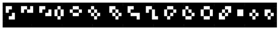 Figure 5 displays the outcome of a search for stationary patterns in the simulation field. We chose a relatively small field to minimize computational demands, as searching for patterns on excessively large fields exerts unnecessary pressure on computational resources and prolongs the simulation. This simple case serves as a demonstration of the search for stationary patterns. Unlike oscillators and mobile structures, stationary structures are insensitive to the introduction of stochasticity into the evolution rules in the implementation described here. Therefore, all three types of rules have common stationary patterns. In future research, it would be interesting to investigate whether certain oscillating or mobile patterns are insensitive to stochasticity, or to investigate those that arise due to stochasticity in the evolution rules and are not present in the original simulation.