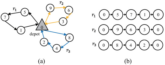 Solution representation for the MOVRPTW. (a) A solution for the MOVRTPW. (b) The solution representation.