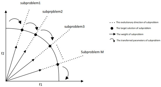 In this study, the MOVRPTW is decomposed into M subproblems using the weighted sum approach [39]. Specifically, a set of weight vectors W is generated for the MOVRPTW using Das and Dennis’s method [40]. These weight vectors are then used to define the objective function of the jth subproblem by the weighted sum approach, as follows: