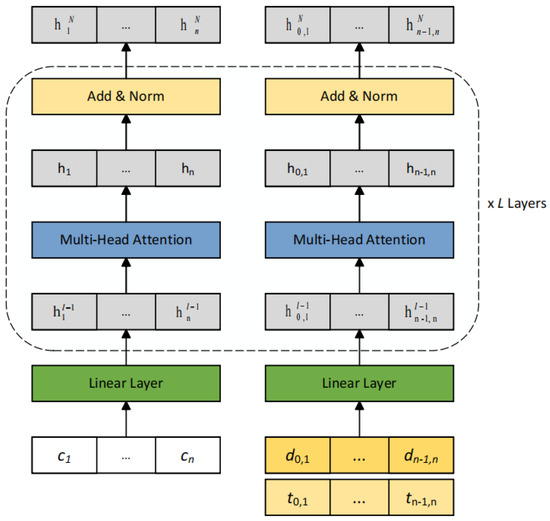 where i denotes the node index and is the dimension of . Then, based on Equation (13), the compatibility of each node is recalculated by transforming the context vector and the embedding vectors of nodes and edges into the corresponding q, k, and v, with the range of , as follows: