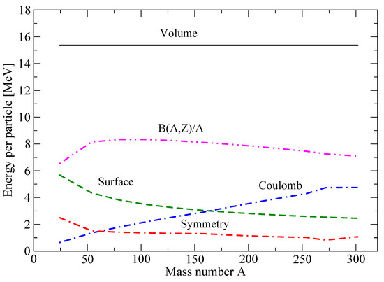 where is expected to be positive and the other three coefficients, , and and are negative []. The first three terms, representing the volume, surface, and Coulomb contributions to , respectively, have classical forms. The energy associated with charge symmetry breaking at the nucleon level is included in the symmetry term with the coefficient . This term is constructed with the assumption that protons and neutrons are fermions with different values of isospin, form non-interacting Fermi gases and obey the Pauli principle. The coefficients in Equation (1) are determined by fitting to the measured nuclear masses []. The A dependence of individual terms in Equation (1) is illustrated in Figure 1. As expected, the interplay between the surface and Coulomb terms is dependent on A, while the symmetry term is contributing around 25% to almost independently of A (except for very light nuclei) across the whole range of A between about 50 and 300.