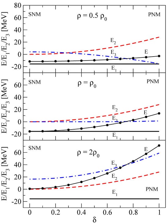 Energy E (full black circles) vs. asymmetry spanning from symmetric () to pure neutron matter (). The individual terms (solid black), (dashed red) and (dot-dashed blue) were calculated with , and M being equal 15.677, 28.062, 294.80, 123.53 and 2.673 MeV, respectively [], for three values of the density 0.5, 1 and 2, corresponding to = 0.167, 0 and −0.333 (top, middle and botton panel), respectively.