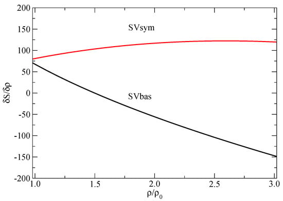 Maximal total particle density in n-p matter created in collisions of symmetric and asymmetric Ca, Sn and Pb systems at beam energies below 800 MeV/nucleon was investigated by Stone et al. [,,]. The pBUU transport model [] was used with two Skyrme forces, SVbas (soft) and SVsym-34 (SVsym for short) (stiff) []. These forces predict a significant difference in the parameter L at saturation, being 34 MeV for SVbas and 81 MeV for SVsym, with rather similar saturation values of J, 30 and 34 MeV, respectively. The distinct difference in the rate of change of the symmetry energy with density as calculated with the SVbas and SVsym Skyrme forces is illustrated in Figure 3.