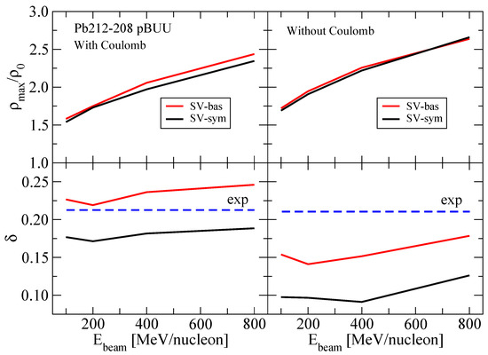 The maximum total particle number density / and related n-p asymmetry = ()/() as a function of beam energy are illustrated in Figure 4 for the case of 212−208Pb collisions at beam energy 200–800 MeV/nucleon. The maximum total density does not exceed 2.5–3.0 and there is only marginal sensitivity of / to density dependence of symmetry energy (top panels). The n-p asymmetry shows almost beam energy independent difference between predictions of SVbas and SVsym models (bottom panels). The SVbas model indicates a minor gain in asymmetry above the experimental value (blue dashed curves) while SVsym never reaches it. Therefore, a slight preference might be given to the soft SVbas model. Interestingly, the simulations revealed a significant role of the Coulomb interaction causing a substantial decrease in with respect to the experimental value []. The Coulomb effect cannot be switched off in the real world and must be taken into account in interpretation of data.