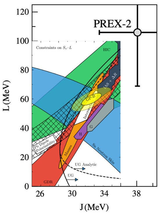 Constraints on the J–L correlation obtained from a variety of experimental and theoretical approaches. The figure was taken from ref. [] to illustrate the tension with the recent PREX-II result.