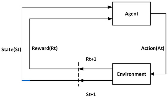 A Markov Decision Process (MDP) is a theoretical framework for goal achievement through interactive learning. An agent observes the current state of the environment and then selects an action. The environment receives the action and transfers it to a new state and gives feedback, usually an immediate reward, based on the current state and the executed action [20]. As shown in Figure 1, at any moment, t, the agent chooses an action, under the condition of the environment state, . At the next moment, , the agent receives the reward, , of the action and updates the environment state it is in .