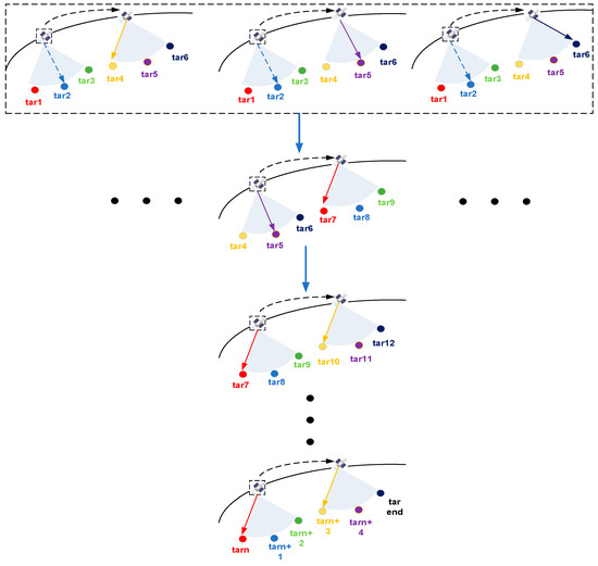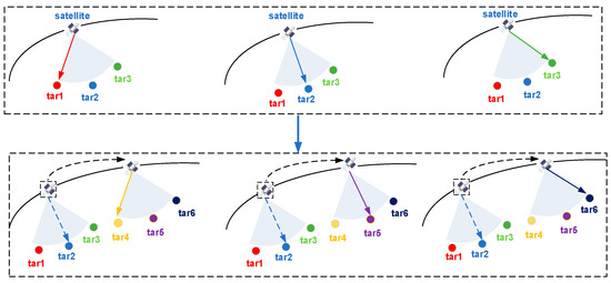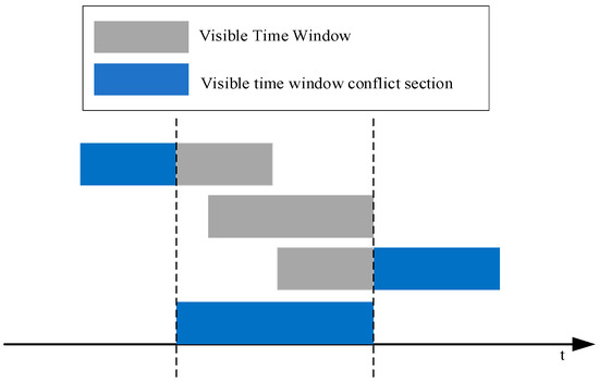 We define as the conflict loss of observing the target. The larger this value is, the higher the conflict between the current mission and the subsequent mission, which ultimately leads to a lower total profit. As shown in Figure 2, the shaded part is the portion of the target that is in conflict with the subsequent targets. The conflict loss value is the sum of the profit of the shaded target points.