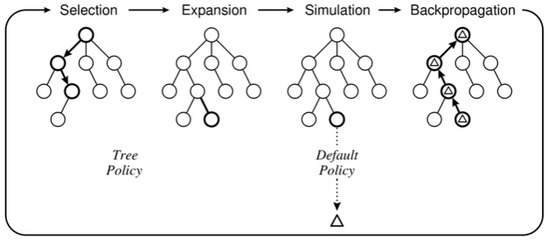 The strategy for the Monte Carlo tree search is divided into two phases: The first one is the in-tree strategy, which is mainly responsible for choosing the next action to be taken. The second one is the default strategy, which is needed to simulate the completion of the sampling of the whole sequence of states if there is no node containing the current state in the search tree. The default policy can use either a randomized policy or a policy based on the objective value function. By combining in-tree and default strategies, the Monte Carlo tree search is able to use simulated sampling to evaluate the value of each state and continuously expand the search tree [21]. Eventually, we can find the optimal action strategy. Figure 3 summarizes several major steps of the Monte Carlo tree search algorithm.