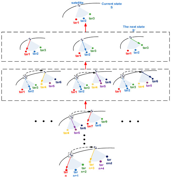 Figure 7 shows MCTS backpropagation. Simulating the profits from satellite mission planning to update the current node as well as path-related root nodes. During the mission planning process, if the profit is higher than before, then , and vice versa . At time , under the condition of state , denotes the profit performing action a. If it is higher than the previous simulation, the profit is +1, and vice versa. The most efficient strategy for calculating the value of a node’s action using backpropagation is to find the average of the results obtained by this node through all the simulations.
