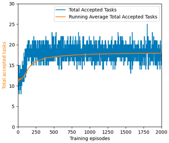 Figure 14 represents the number of total missions accepted by the algorithm, where the blue line represents the measured value and the orange line represents the trend value. As the number of training times increases, the number of total missions accepted by the algorithm gradually improves in the phase. When the training reaches more than 500 episodes, the number of missions tends to converge and eventually improves to about 18.