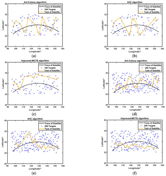 (a) Results of the 100 targets via ACO algorithm; (b) results of the 100 targets via A3C algorithm; (c) results of the 100 targets via Improved-MCTS; (d) results of the 200 targets via AC algorithm; (e) results of the 200 targets via A3C algorithm; (f) results of the 200 targets via Improved-MCTS.