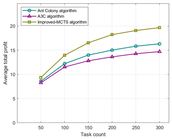 We divided the experiments into six groups according to the mission count, and each group contained simulations of 10 different scenarios, and the results are shown in Figure 16. From the figure, we can visualize that the Improved-MCTS has higher profit than the other two algorithms, and the gap becomes more and more obvious as the mission count increases.