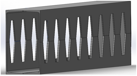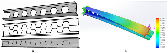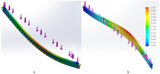 As a substitute for the conventional I-beam design, we suggest employing box-shaped welded beams manufactured from hot-rolled shvellers in accordance with standard 8240-89, employing waste-free techniques (see Figure 5). Essentially, this structure constitutes a welded I-beam with a perforated wall, cut along the wall and butt-welded along the flange edges. Computational analysis of these box-shaped welded beams with a perforated wall (see Figure 6) revealed notable advantages over the previously examined options. In drawings created by the SolidWorks system, the movements of the points in the body are displayed in different colors (blue—no or minimal movement, red—maximum movement, the rest of the colors in rainbow order—intermediate values) and are shown on an enlarged scale specified by the user. The loads are shown by arrows, and the intensity determines the length of the arrow in the selected scale. The ends of the beams are cantilevered; this can be seen from the set of reactive forces at the ends and the absence of their displacements.