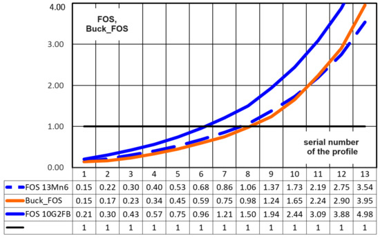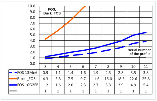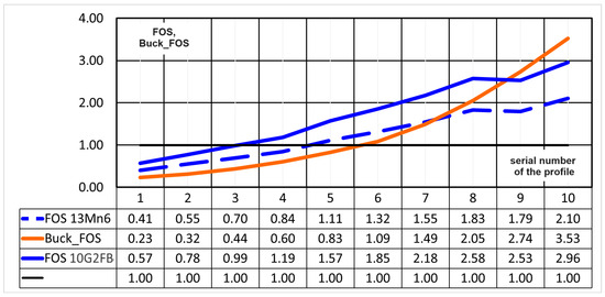 A preliminary assessment conducted to identify a rational design confirmed the limited effectiveness of weight reduction for perforated beams compared to hot-rolled beams of equivalent load-bearing capacity, primarily due to decreased buckling loads in the perforated beams. When comparing the stability coefficient of hot-rolled beams (the ratio of buckling load to actual load, known as the buckling factor of safety, Buckl_FOS [40]) and the factor of safety (FOS), it is evident that their permissible levels almost match for the same profile number, especially for structural steel 13Mn6. Figure 3 illustrates the dependencies of these coefficients for beams spanning 6 m on the serial number of the profile under a uniformly distributed load with an intensity of 1.5 t/m and hinged end connections, constructed from both structural steel 13Mn6 and economically alloyed steel 10G2FB. That is, the use of alloy steel increases the strength coefficient of the beam, but not the stability coefficient. Since the stability coefficient is the main limiting parameter for such a design, replacing the material with a more expensive one makes no sense.