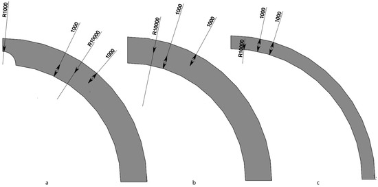 Design parameters were varied within specific limits: the arch radius was set to 10 m, the cross-section height ranged from 1 m to 2 m, the cutout radius varied, and the height of the cross-section of the reduced arch was equaled. The arch schemes at m and m, utilized for modeling, are depicted in Figure 8.