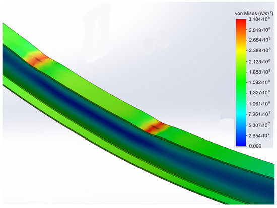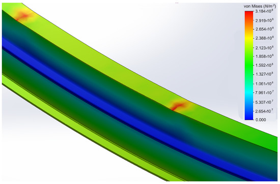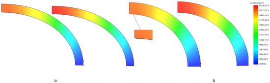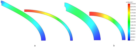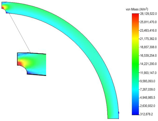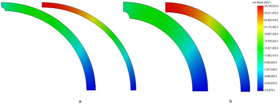 We examined the effect of a uniform external pressure with the intensity of 500 Pa applied to the outer boundary of the arch. The arch is composed of alloyed structural steel 20KhGSA, with a Young’s modulus of MPa, yield strength of 0.62 GPa, and Poisson’s ratio of 0.28. The lower section of the arch is either rigidly constrained or supported by a hinge, while the upper section features a sliding constraint, which simulates the symmetry conditions for a semicircular arch. The modeling was conducted using the SolidWorks software package (https://www.solidworks.com) [25]. The mesh was automatically generated and adaptively rebuilt to match the object’s shape, with a minimum of 36 elements along the arc section of the arch and a maximum cell size of 25 mm. The calculation continued with mesh refinement until the desired accuracy was achieved. Figure 9, Figure 10, Figure 11, Figure 12, Figure 13, Figure 14, Figure 15, Figure 16 and Figure 17 depict Von Mises stresses [42] and displacements.