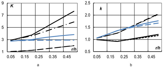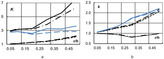 The concentration coefficient for this calculation will be considered as the ratio of the maximum value of the parameter under study for one of the calculation schemes (with cutout (model I), without cutout (model II), reduced (model III), Figure 8) with the maximum value of this parameter for another scheme. By arch thickness, we mean the difference between the outer and inner radii of the arch in the bending plane. The calculation of the stress concentration factor K in an arch with a cutout (model I) and in the reduced arch without a cutout (model III), compared to the maximum stresses of the original arch without a cutout (model II) in the case of rigid constraint on the lower end, is depicted in Figure 14a. Additionally, Figure 14b presents the coefficients representing the ratio of the amplitudes of maximum displacements k in an arch with a cutout (model I) and in the reduced arch without a cutout (model III), compared to the maximum stresses of the original arch without a cutout (model II), under the condition of rigid constraint on the lower end of the arches.