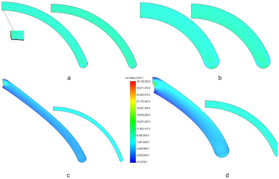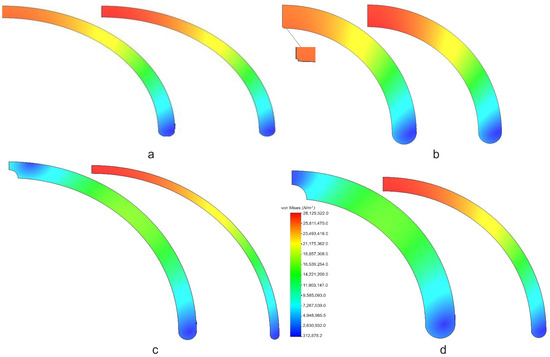 Von Mises stresses in elastic arches: (a) , m. (b) , m. (c) , m. (d) , m.