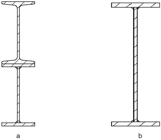 Application of the combined method proposed previously for structural analysis of industrial buildings and structures, along with the integration of economically alloyed steels, presents opportunities for the development of novel designs of critical elements [44,45,46,47,48]. It is shown that an effective type of beam with a perforated wall is a box-shaped structure made of perforated hot-rolled channels manufactured using waste-free technology. At a given load, the discrete optimization of the cross-section of a box beam made from a range of hot-rolled channel profiles was carried out. It is shown that through the use of the proposed cross-sectional shape, significant savings in the weight of the structure by more than 31% can be achieved.