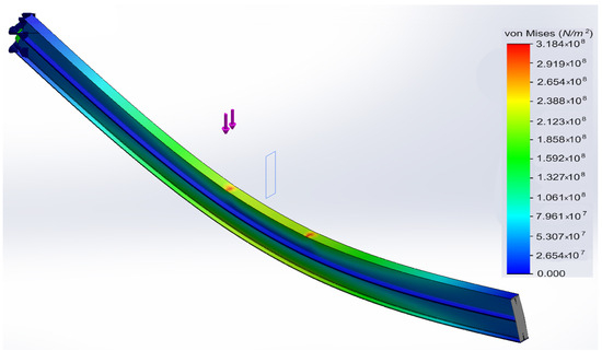 Firstly, an assessment of the static stress-strain condition of the beam under operational loads was conducted to validate the beam’s load-bearing capacity (refer to Figure 20). In the examined beam, the highest stresses, approaching the plastic limit of the steel, were localized within the load zone. These operating conditions pose significant challenges for the crane girder.