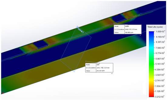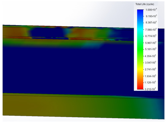 It is apparent that the welds between the beams are situated within the region of minimal deformations and do not significantly influence the fatigue strength of the structure. This assertion is supported by the fatigue calculation results (refer to Figure 23): the welds in such a configuration endure over 1 million cycles, nearing the design standard.