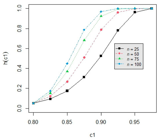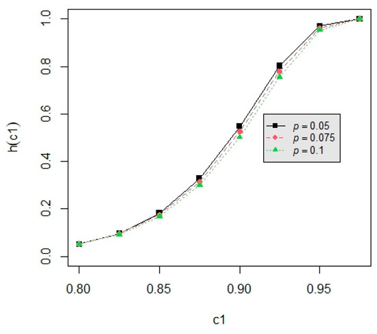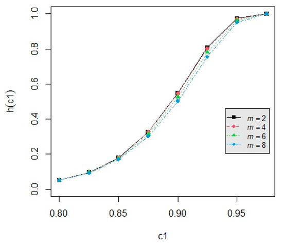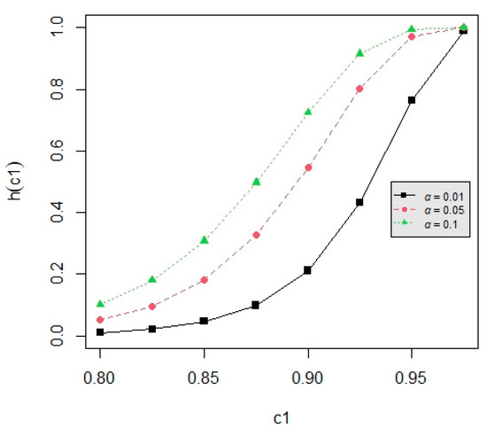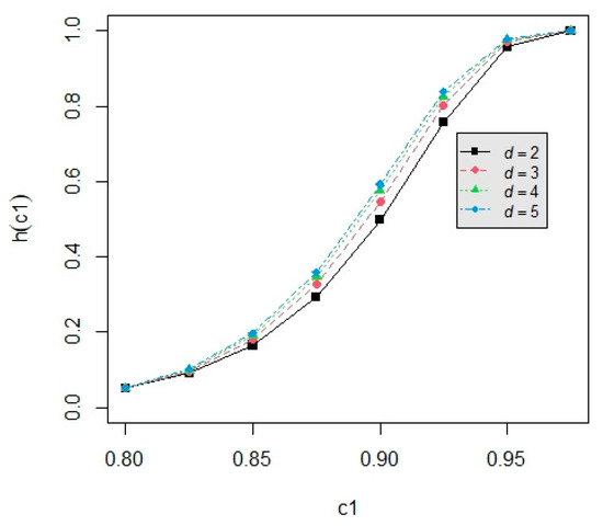 To test , the powers h(c1) are computed using Equation (28) and they are presented in Table A1, Table A2, Table A3, Table A4, Table A5, Table A6, Table A7, Table A8 and Table A9 for d = 2, 3, 4 with α = 0.050, 0.075, 0.100, respectively, for c1 = 0.8, 0.825, 0.85, 0.875, 0.9, 0.925, 0.95, 0.975; m = 2, 4, 6, n = 25, 50, 75,100; and p = 0.050, 0.075, 0.100 with L = 0.05, T = 0.5. The power values depicted in Figure 3, Figure 4, Figure 5, Figure 6 and Figure 7 serve to exemplify various standard cases. Our observations are as follows: (1) In Figure 3, decreasing p enhances the power when d = 1, n = 25, m = 4, and α = 0.05. This behavior is consistent across different combinations of d, n, m, and α. (2) In Figure 4, as n increases, the power rises with d = 1, m = 4, p = 0.05, and α = 0.05 held constant. Similar patterns emerge across various combinations of d, n, p, and α. (3) In Figure 5, decreasing m enhances the power for fixed values of d = 1, α = 0.05, n = 25 and p = 0.05. (4) In Figure 6, the power increases with α under d = 1, n = 25, m = 4, and p = 0.05. This trend is observed across various combinations of d, n, m, and p. (5) In Figure 7, the power improves as d increases with n = 25, m = 4, p = 0.05, and α = 0.05 held constant. This trend remains consistent across different combinations of n, m, p, and α. The improvement in power is getting not significant when d is greater than 3. (6) Across Figure 3, Figure 4, Figure 5, Figure 6 and Figure 7, the power increases with the value of c1 for any combination of d, n, m, p, and α.