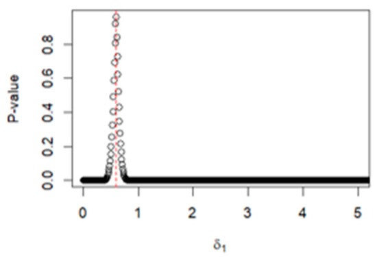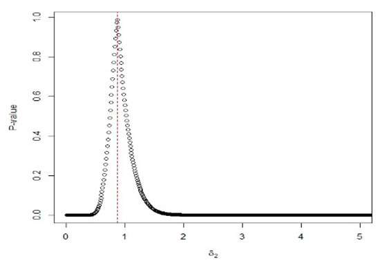 The data for the lifetimes of the second component consists of n = 50 failure times in Aarset [28]. The data of U2j, j = 1, …, 50, is listed as follows: 0.001, 0.002, 0.010, 0.010, 0.010, 0.010, 0.020, 0.030, 0.060, 0.070, 0.110, 0.120, 0.180, 0.180, 0.180, 0.180, 0.180, 0.210, 0.320, 0.360, 0.400, 0.450, 0.450, 0.470, 0.500, 0.550, 0.600, 0.630, 0.630, 0.670, 0.670, 0.670, 0.670, 0.670, 0.720, 0.750, 0.790, 0.820, 0.820, 0.830, 0.840, 0.840, 0.840, 0.850, 0.850, 0.850, 0.850, 0.850, 0.860, 0.860. Similarly, Figure 9 shows the p-values vs. the values of δ2. Figure 9 reveals that the p-value peaks at 0.9881 when δ2 = 0.87, so δ2 is concluded to be 0.87.