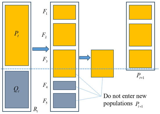 According to the nondominated sorting strategy of NSGA-II, as illustrated in Figure 1, suppose the population size is N, and Population (with a size of 2N) is formed by combining the current dominated solution set and the current offspring . Following the dominance relation, obtains a series of nondominated Pareto solution sets denoted as where is at the top level. If the quantity of F1 is less than N, all members of F1 are selected into Population . The remaining members in Population are chosen from , and so forth, until the total number of members reaches N. Notably, the order of the first member in is less than N, while the order of the last member is greater than N. To maintain population diversity, the NSGA-II algorithm employs CD sorting on . Individuals with a larger CD are given priority to enter Population . The CD calculation method is expressed in Formula (1).