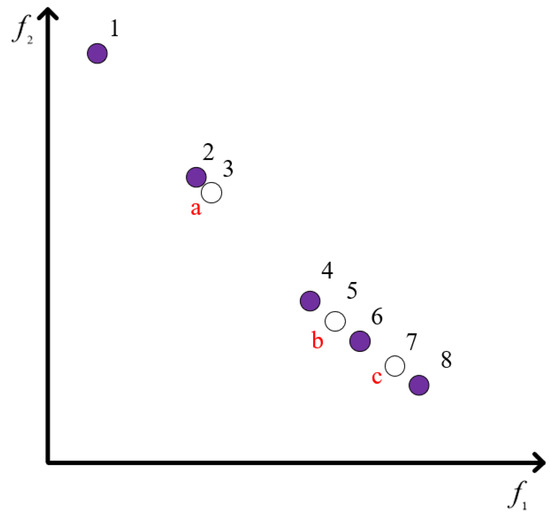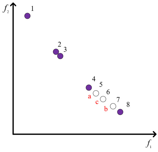 The NSGA-II algorithm ensures diversity through a crowding distance strategy. However, as previously discussed, when the distance between two individuals is very close, and the crowding distance is large, this method may struggle to effectively preserve population diversity. This article introduces a strategy based on the balance of the distance between individuals. Initially, the individual with the smaller crowding distance among two individuals with the closest distance is eliminated. This process is repeated sequentially until the desired number of populations is reached. Illustrated in Figure 4, the initial elimination includes individual 3, followed by the sequential elimination of individuals 5 and 7. The final selection comprises individuals 1, 2, 4, 6, and 8, resulting in a more uniform distance between populations and better preservation of diversity.