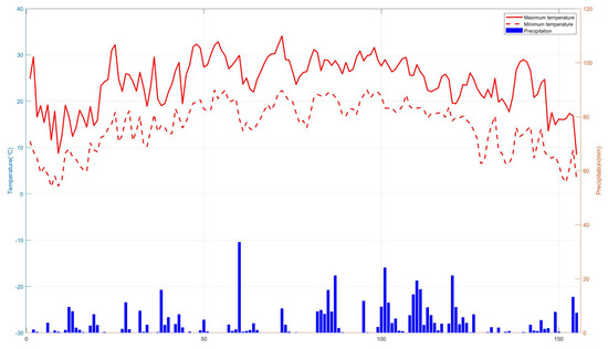 Fine-tuning a variety of parameters is vital for accurately simulating the local growth environment. Maize (Longdan 96) has a plant height of 280 cm and an ear height of 100 cm. 18 leaves can be seen in adult plants. The number of rows per ear is 16–18, with teeth-shaped and yellow grains, and a weight of 34 g per hundred grains. It is suitable for planting in the first accumulated temperature zone of Heilongjiang Province (data sourced from Heilongjiang Academy of Agricultural Sciences). In this experiment, field data from 2015 were gathered, and the parameters in the variety parameter file were adjusted using a trial-and-error method. Weather data spanning from 2011 to 2015 for average optimization were employed. The weather data for 2015 are shown in Figure 6. The DSSAT model can effectively use these parameters to simulate the growth of local crops.