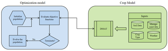 A common challenge in MOPs is devising methods to swiftly attain a convergent solution while also achieving a more evenly distributed solution set [10,11]. To better solve more complex problems, in recent years, various multi-objective evolutionary algorithms (MOEA) have been proposed, including NSGA-II [12], MOEA/D [13], SPEA2 [14], and other algorithms. Since their inception, these algorithms have garnered immense attention from researchers due to their impressive global search performance, high-speed operational efficiency, and straightforward algorithmic framework. These multi-objective optimization algorithms are applied to agricultural models. Zhou and Fan [15] optimized the agricultural industry structure through a genetic-algorithm-based MOP to achieve sustainable development. Llera [16] et al. optimized control settings using the NSGA-II algorithm to help growers achieve maximum yield and minimize costs under greenhouse conditions. Cheng [17] et al. optimized the irrigation and fertilization plan for winter wheat by combining the NSGA-II algorithm with the DSSAT model. Song [18] et al. optimized the spring wheat irrigation plan using the AquaCrop model and NSGA-II algorithm. Liu and Yang [19] constructed a distributed AquaCrop model and NSGA-II for simulation optimization to develop effective irrigation plans. Despite the theoretical and experimental effectiveness of these classic algorithms, they exhibit significant shortcomings in practical applications, particularly regarding convergence speed and solution consistency. Specifically, when addressing high-dimensional and complex problems, the existing algorithms often require extended periods to achieve satisfactory solutions. In practical applications, rapid convergence is essential for conserving computational resources and time. Furthermore, the solutions generated by the current algorithms can vary significantly between different runs, leading to insufficient reliability. Ensuring solution consistency is crucial for maintaining the stability and reproducibility of results.
