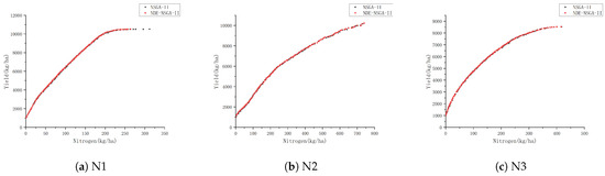Figure 8 illustrates that in the absence of irrigation, the utilization of N1 fertilizer not only results in a higher yield (10,515 kg/ha) but also requires less fertilizer compared to the other two fertilizers. Furthermore, the enhanced algorithm identifies a more rational fertilization strategy. For instance, at the point of maximum yield (10,515 kg/ha), the original algorithm utilized 312 kg/ha of fertilizer, whereas the improved algorithm required only 264 kg/ha, reflecting a 15% reduction in fertilizer application compared to the original algorithm. This outcome substantiates the reliability and efficacy of the improved algorithm.
