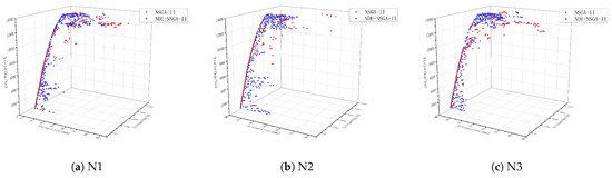 Table 1 displays the average GD+ values, accompanied by standard deviations (in parentheses), for the four algorithms, with optimal values highlighted in bold font. Furthermore, a Wilcoxon rank-sum test was performed at a significance level of 0.05. Symbols such as “+”, “−”, and “=” in the final row denote whether the respective algorithm is significantly superior, significantly inferior, or similar to the proposed NDE-NSGA-II.