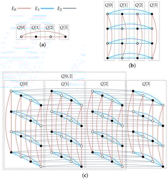 Let i be a specific dimension in . Then, along its i-dimensional edges, can be divided into k disjoint subgraphs: (written for short for every . It is clear that each subgraph is isomorphic to , where . For , define (or to be the subgraph induced by the vertex set . In particular, we have if . And, we have if by taking modulo k. Illustrations for are shown in Figure 1, where .