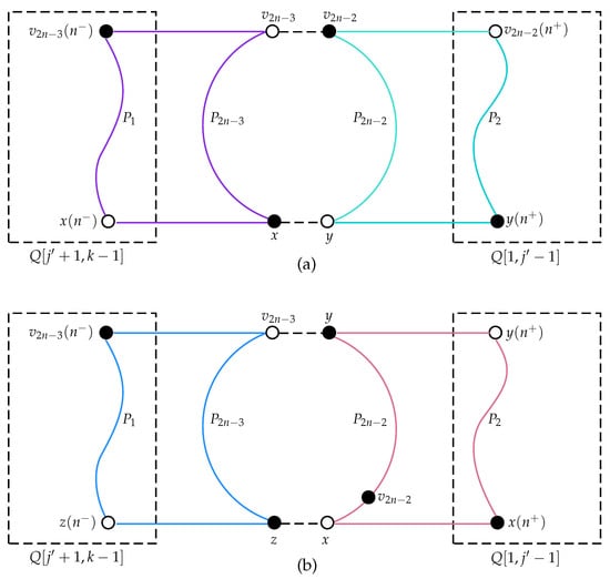 Case 2.2.1. Let . Furthermore, if is adjacent to on , one may assume that . Note that is bipartite with even k, and we have . Since , it follows that there exist such x and y satisfying , , and . By Lemma 1, there is a Hamiltonian path joining to passing through every vertex of . Meanwhile, there is a Hamiltonian path joining to that spans . Let and . Then, is a desired 2-factor of ; see Figure 2a for an illustration.
