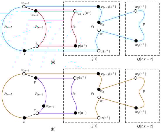Now, assume that is not adjacent to on and . It is easy to see that . Let . Thus, we have and . Lemma 2 gives a paired 2-disjoint path cover in such that is a path joining to , and is a path joining to . Moreover, let be an edge of the path cover. Without loss of generality, assume that is on , and . Lemma 1 gives a Hamiltonian path P joining to that spans . Let and . Then, is a desired 2-factor of ; see Figure 3b for an illustration.