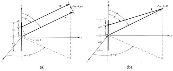 where R is the distance between the current micro-element and the observation point. Because we are focusing on the FfR radiation characteristics of the diploe, we can assume that , θ′ ≈ θ [].
