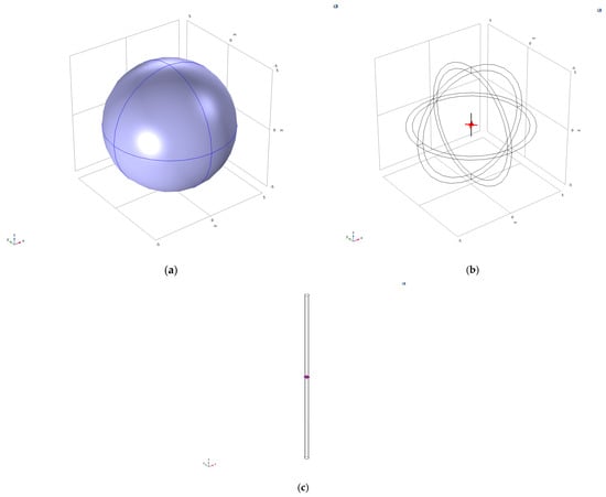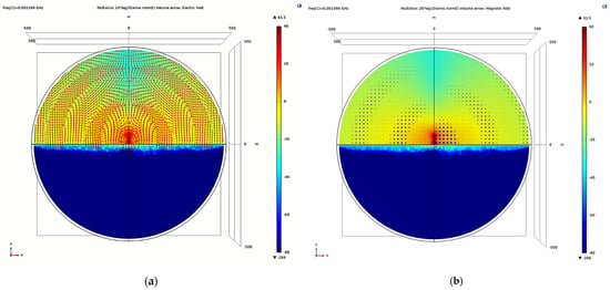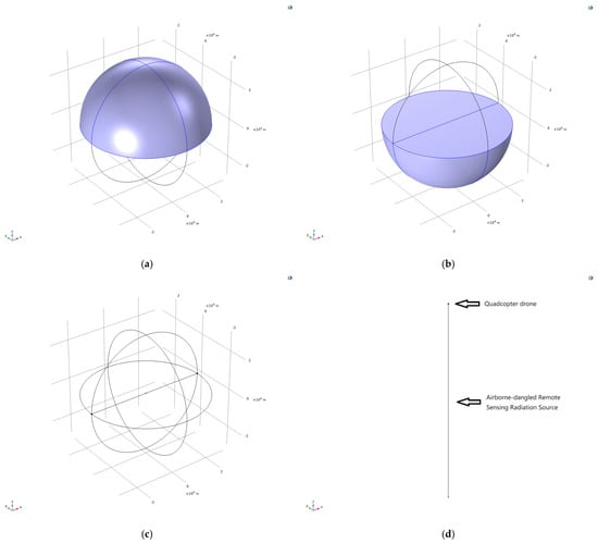 Figure 10 revealed an airborne-dangled monopole-antenna symmetric remote-sensing radiation source model, which consists of sphere models with a radius of 500 m. The upper half-space of the models is the air domain, the parameter settings of which are consistent with Figure 2; the lower half-space of the models is a soil domain with , and . In Figure 10, an airborne-dangled monopole-antenna symmetric remote-sensing radiation source model with a 25 m length and a 0.0125 m radius is depicted, which is perpendicular to the surface of a uniform half-space.