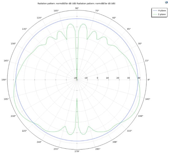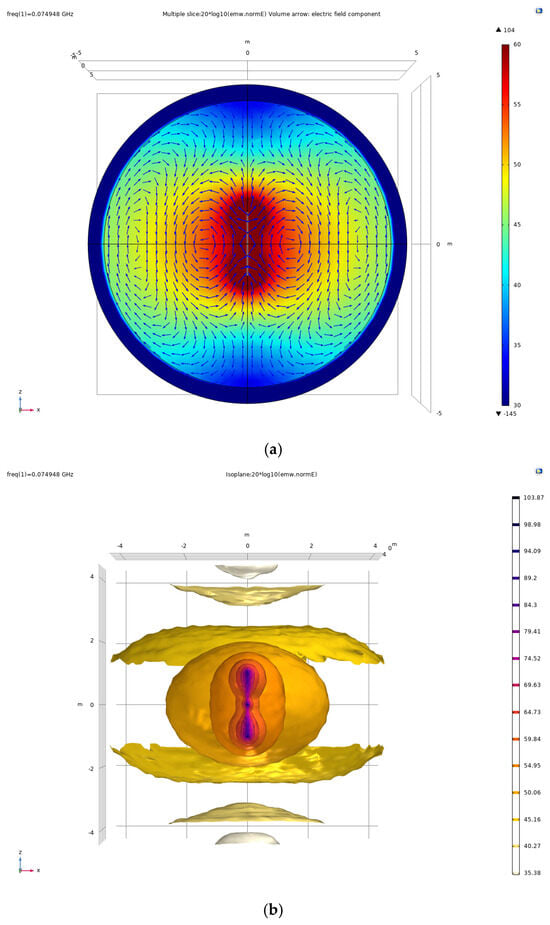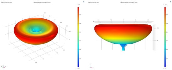 As previously discussed, the two-dimensional pattern reveals a nearly circular shape on the magnetic field surface, whereas the electric field surface exhibits axisymmetric divergence, with concavity in the center and divergence on both sides. This observation aligns with the expected radiation characteristics of finite-length dipole antennas analyzed earlier.