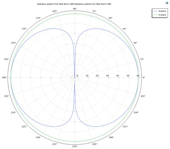The polar plot in Figure 4 illustrates the directional pattern in the xy-plane, while Figure 5 provides a three-dimensional visualization of the radiation intensity distribution in the far-field region. Both representations affirm the anticipated omnidirectional radiation pattern characteristic of the dipole antenna under study.