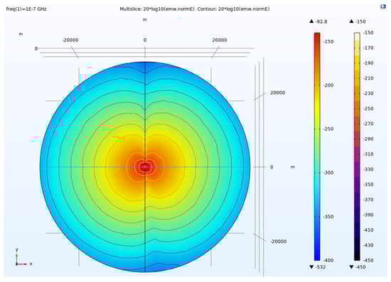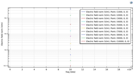 The electric field values (from 1000 m to 10,000 m) were extracted using the electric field value probe tool in COMSOL software, as shown in Table 2. Table 2 shows the electric field values from 1000 m to 10,000 m, with an electric field value of 2.01 × 10−6 V/m at 1000 m, 8.57 × 10−9 V/m at 5000 m, and 1.24 × 10−10 V/m at 10,000 m.