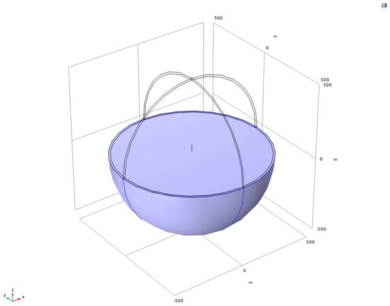 In order to provide a more intuitive explanation of the radiation characteristics of a single electric dipole artificial field source placed on a uniform half-space surface in CSAMT, a half-space model with analytical solutions was established in the COMSOL software (the version 5.6) environment, as shown in Figure 6. The model is a sphere with a radius of 30 km. The upper half of the space is air (, and 0 Sm−1); the lower part of the space consists of soil (, and 0.01 Sm−1).