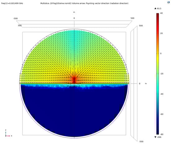As depicted in Figure 8, the axial view illustrates the configuration of an artificial field source generated by a single electric dipole antenna. The depiction delineates the upper half-space as the atmospheric domain, representing air, while the lower half-space denotes the subterranean domain, representing the earth’s medium. The visual representation underscores a conspicuous observation: electromagnetic wave attenuation within the soil medium is markedly more pronounced compared to propagation through the atmospheric medium. Moreover, the figure highlights that the propagation distance of electromagnetic waves in soil is substantially curtailed relative to their propagation in air. These phenomena are intricately linked to the distinct electromagnetic properties intrinsic to the earth’s medium, as substantiated by established principles in electromagnetic field theory [].