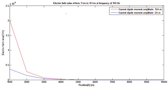 Comparison of electric field values from 1 to 10 km under two different current dipole moments at a frequency of 100 Hz.