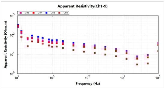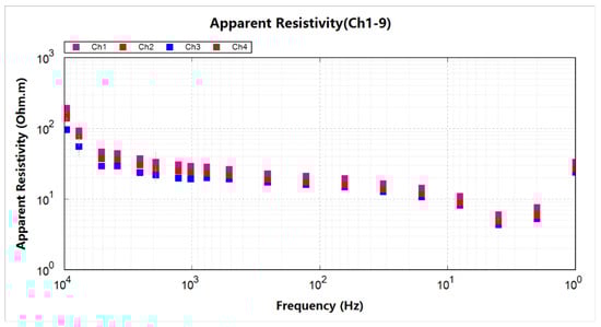Figure 20 depicts the apparent resistivity measurements at a specific point in the FfR under the influence of airborne-dangled monopole-antenna remote-sensing radiation. To mitigate potential errors, measurements were iteratively conducted four times. The observed apparent resistivity values exhibit significant variability, spanning from 3 ohm·m to 350 ohm·m across frequencies ranging from 1 Hz to 10,000 Hz. This characterization underscores the diverse electromagnetic responses encountered within this frequency spectrum, crucial for understanding the environmental and geological implications of the remote sensing methodology employed.