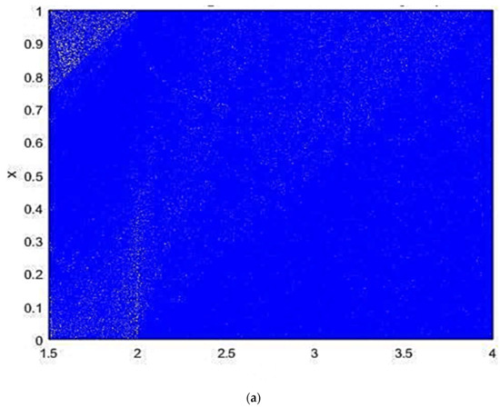 where and parameter . This combination leverages the distinct chaotic properties of both the Tent Map and the May Map. The Tent Map contributes its well-known piecewise linearity and uniform stretching, which enhance diffusion properties essential for cryptographic strength. On the other hand, the May Map, rooted in population dynamics, introduces nonlinear exponential terms that add complexity and unpredictability. This hybrid approach aims to exploit the strengths of both maps to create a more robust and secure chaotic system.